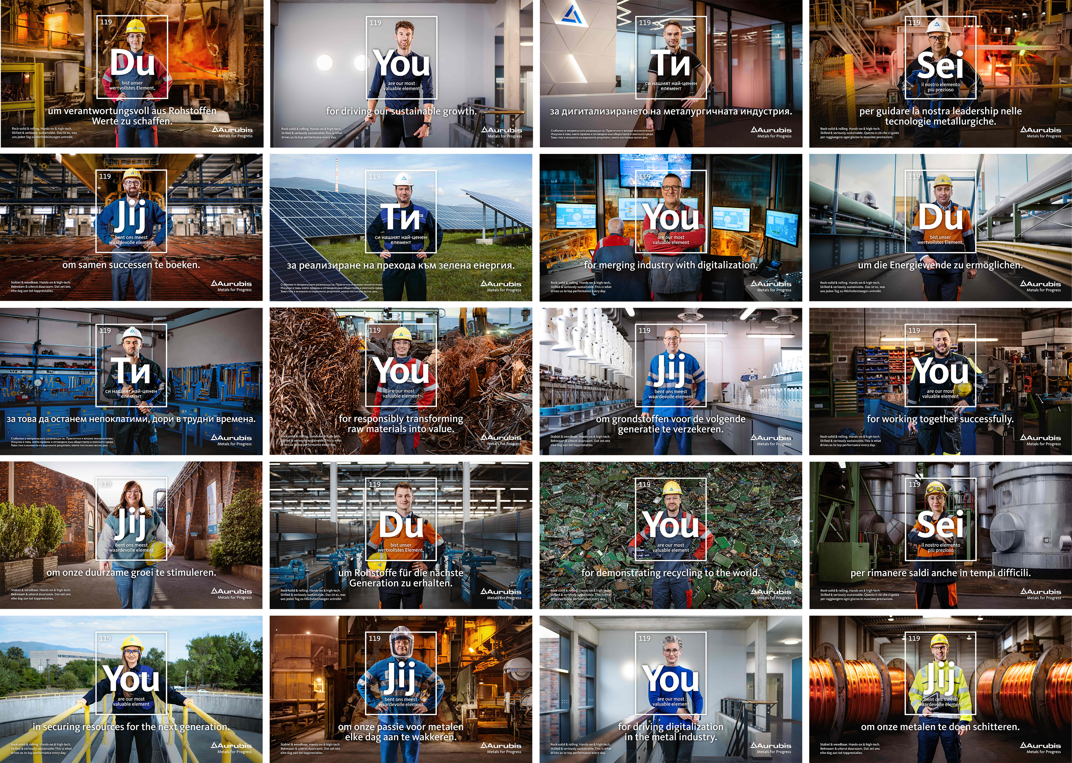 Das starke Argument des gesellschaftlichen Beitrags greift auch das Gestaltungskonzept der neuen Arbeitgebermarke auf. Es zeigt die Vielfalt der Aurubis-Mitarbeiterinnen und Mitarbeiter in unterschiedlichsten Arbeitsumgebungen innerhalb des Multimetall-Unternehmens. Angelehnt an die Darstellung des Periodensystems mit seinen 118 Elementen, zeigen mehr als 35 Motive die Belegschaft als zusätzliches 119. Element. Das „wertvollste Element”, um einen entscheidenden persönlichen Beitrag zu leisten, um gemeinsam wichtige Herausforderungen von heute und morgen zu meistern.