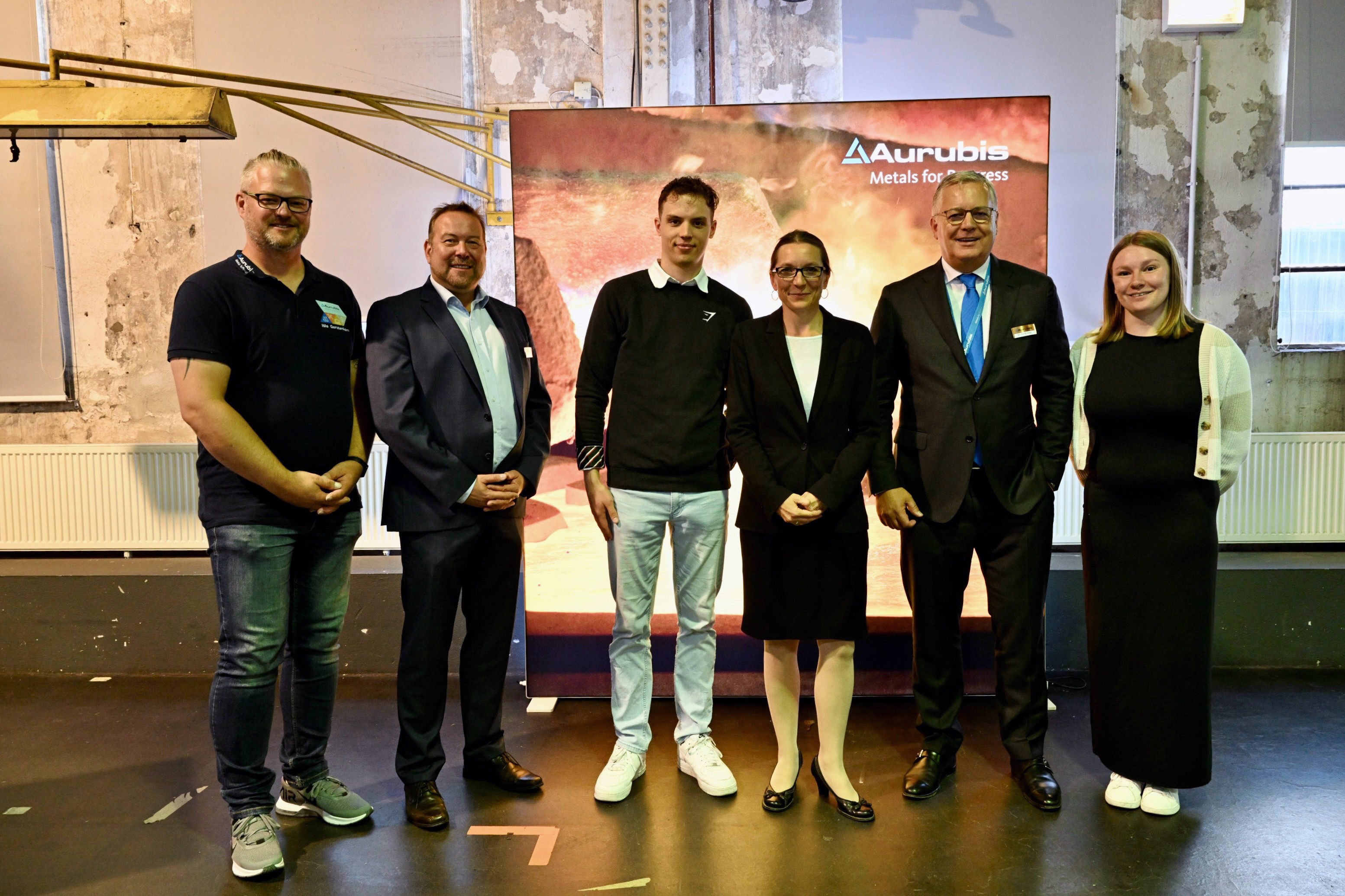 Pressebild: Auszubildende mit Aurubis-Vertretern und Ksenija Bekeris