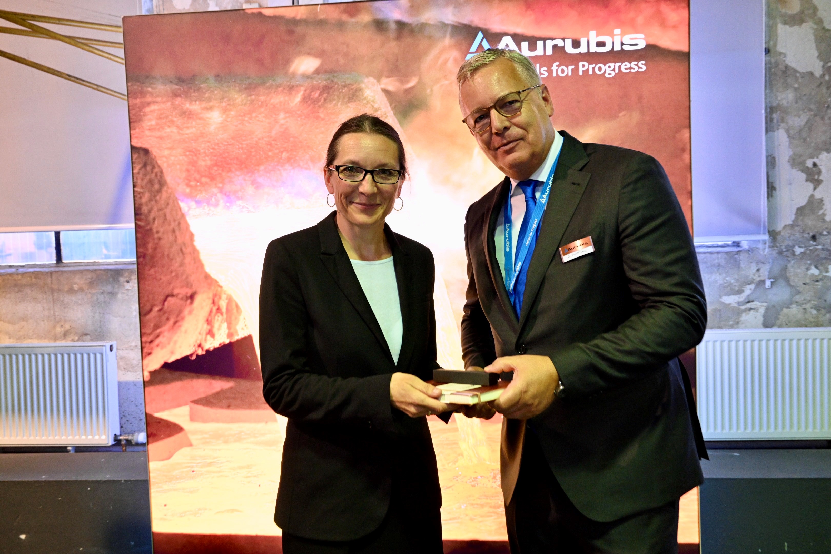 - Ksenija Bekeris, Hamburgs Senatorin für Schule und Berufsbildung, und Aurubis‘ Vorstandsvorsitzender Dr. Toralf Haag begrüßen neuen Ausbildungsjahrgang
